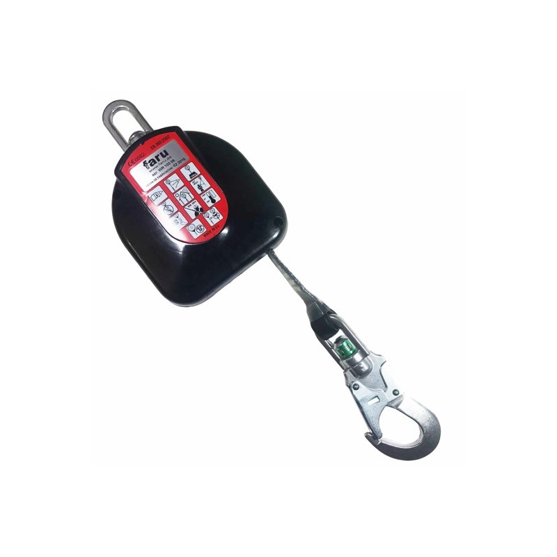 Anticaigudes retràctil automàtic amb sistema de frenada per inèrcia, absorbidor d'energia intern i carcassa protectora plàstica. Ganxo dʻobertura 24 mm. La cinta de poliamida de 17 mm d'amplada es manté en tensió constant i segueix l'usuari en el seu desplaçament, concedint-li gran llibertat de moviments. Model lleuger i pla amb dues peces rotatòries per evitar embolics. Testimoni de caiguda.