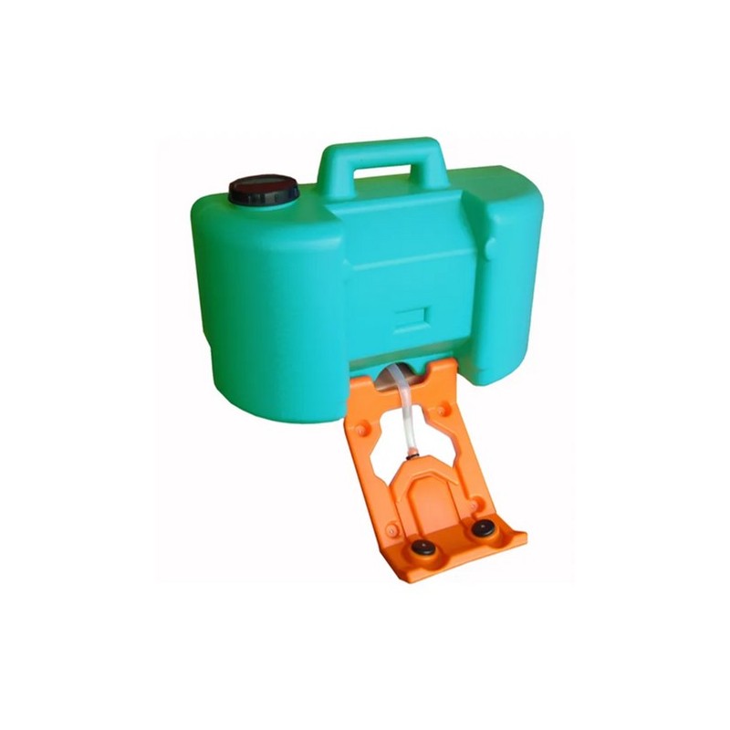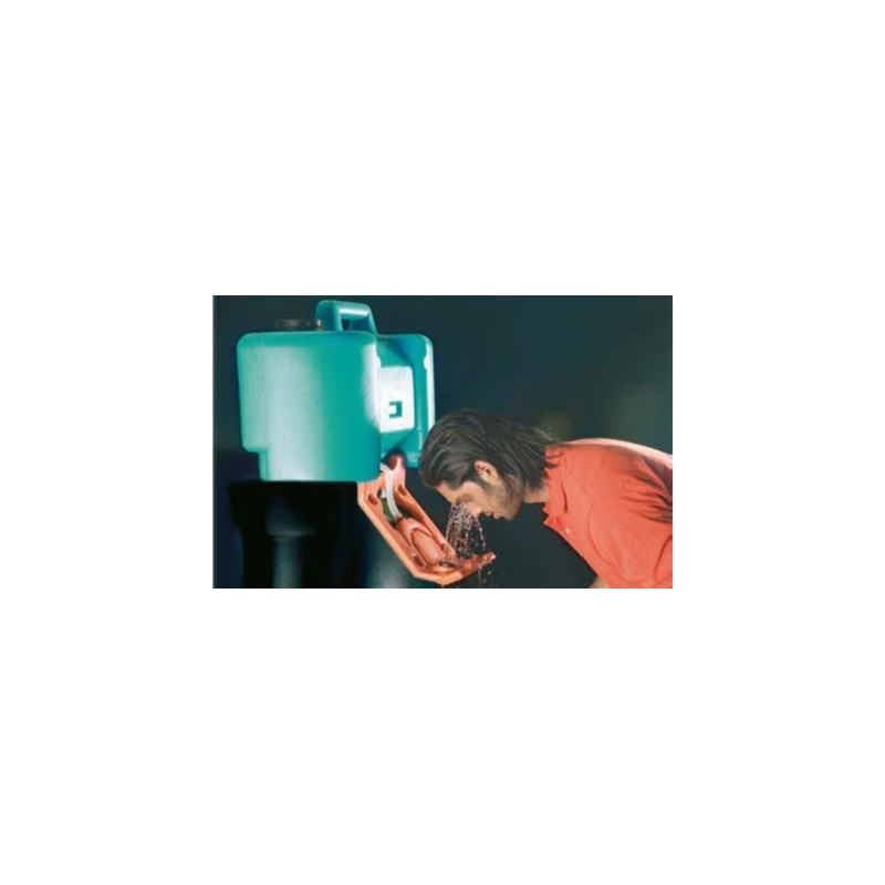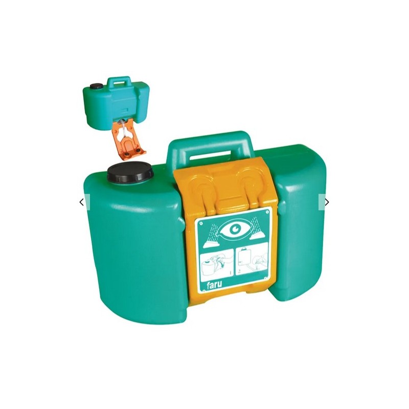 Contenidor mural portàtil amb caiguda per gravetat que proporciona un flux daigua durant 15 minuts. El flux daigua sactiva activa tirant de la safata retractable. La safata en posició recollida protegeix la sortida de laigua de la contaminació ambiental. Proveït de subjeccions per ancorar a la paret. Es subministra buit i s'ha d'emplenar amb aigua potable.