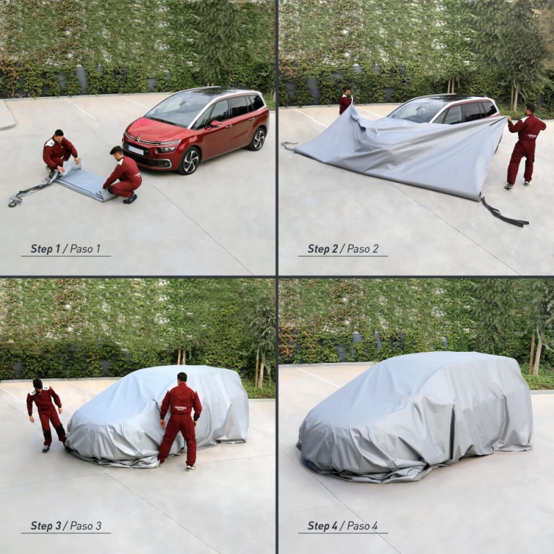 Amb una superfície de 6x9 m (54 m²) aquesta manta apaga foc permet cobrir la majoria dels cotxes en cas d'incendi, fins i tot SUV i tot terrenys. Per col·locar-los correctament i per motius de seguretat, en cas d'incendi es recomana la intervenció d'almenys 2 persones. Incorpora 4 agafades per facilitar-ne la col·locació, 2 de color fosc al costat dret i 2 de color clar al costat esquerre.