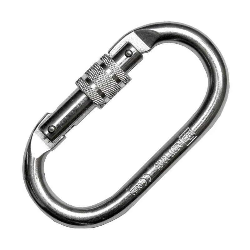 Mosquetó per a connexió d'equips anticaigudes, amb tancament de rosca. Fabricat en acer galvanitzat, resistent a la corrosió.