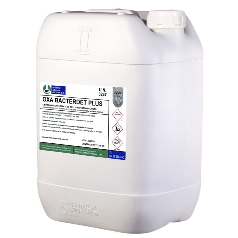 OXA–BACTERDETPLUS es un detergente de alcalinidad moderada con elevado poder limpiador y que incorpora en su fórmula productos de acción microbicida de amplio espectro. Elimina con facilidad las acumulaciones de suciedad difícil sin atacar a ningún tipo de superficie debido a su carácter ligeramente alcalino. OXA–BACTERDETPLUS a una concentración del 4% es eficaz como desinfectante bactericida y destruye las bacterias que producen malos olores en el ambiente. Diluido al 5% también es eficaz como desinfectante fungicida y virucida.
