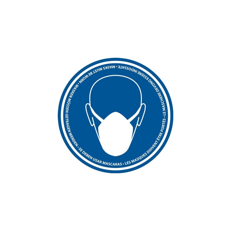 Señal adhesiva y laminada para suelo con mensaje de obligatorio llevar mascarilla en 5 idiomas (Español, Ingles, Aleman, Italiano y Francés)