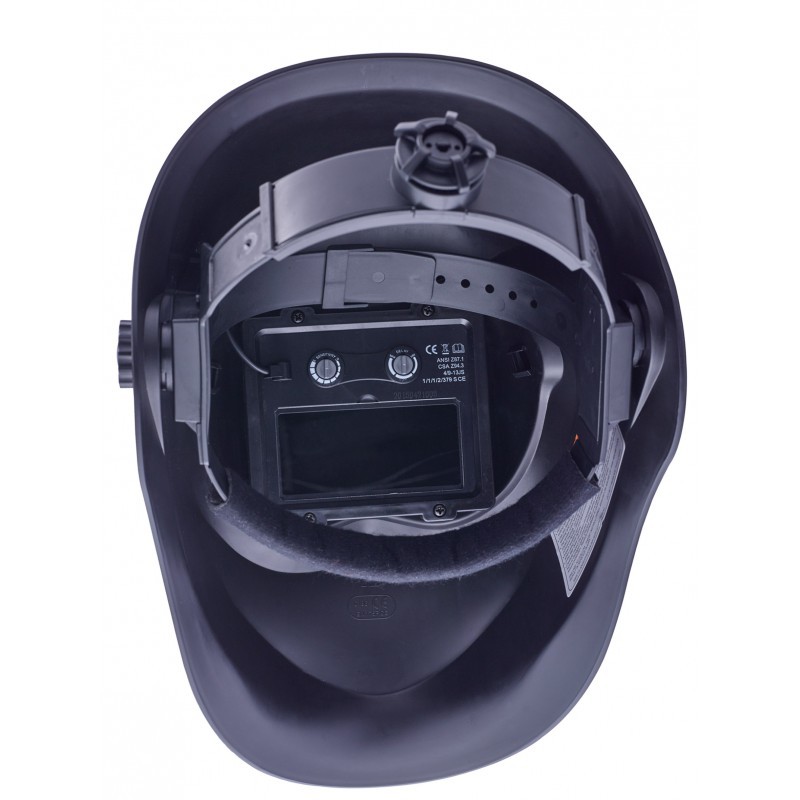Pantalla de soldadura con filtro automático de tonalidad variable de 4/9-13 (tono fijo 4 y variable de 9 a 13). Velocidad de reacción 1/25,000 segundos. Cuerpo de polipropileno rígido y resistente. Dimensiones del filtro 110x90 mm. Cubrefiltro de protección incoloro. Arnés con banda de confort y regulación mediante un sistema piñón/cremallera.