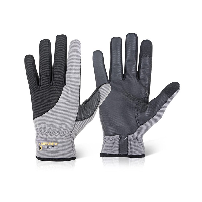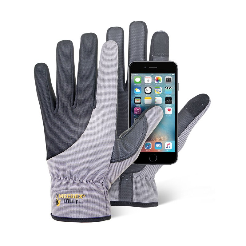 Guante de piel sintética y poliuretano que lo hacen compatible con los teclados táctiles de pantallas de dispositivos móbiles como tables o teléfonos. Dorso de Spandex que proporciona un alto nivel de conform y elascticidad.