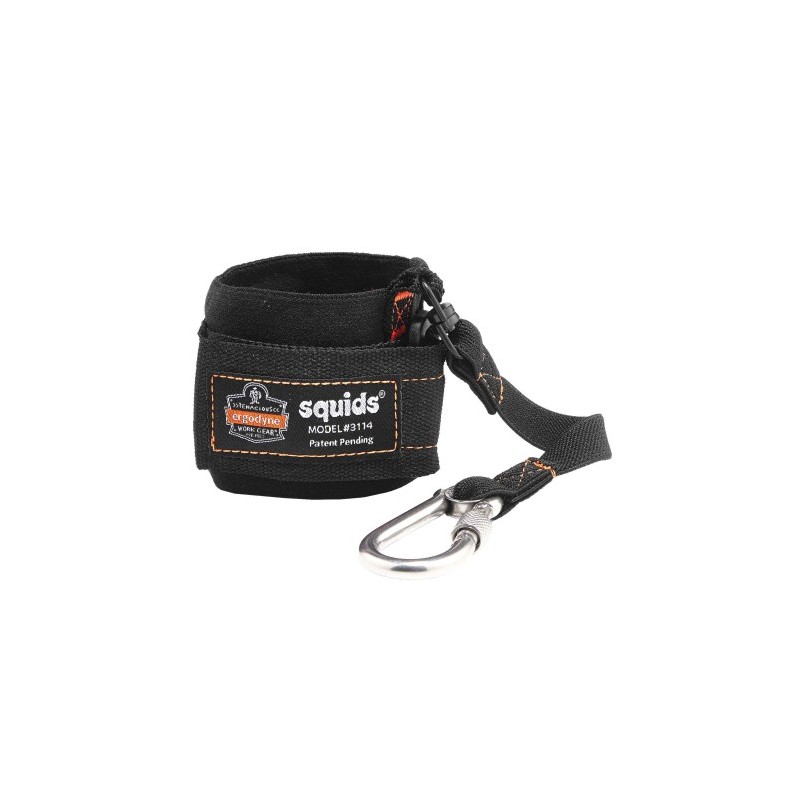 Dispositivo de amarre de herramientes mediante muñequera y extensión de nylon con mosquetón. Dispone de un bolsillo oculto para guardar el mosquetón mientras no se usa con herramientas. Apto para herramientas de hasta 1,4 Kg.